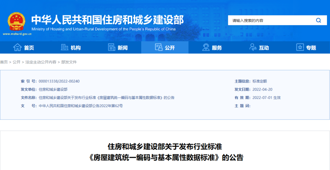 住房和城鄉(xiāng)建設(shè)部日前發(fā)布公告,批準(zhǔn)《房屋建筑統(tǒng)一編碼與基本屬性數(shù)據(jù)標(biāo)準(zhǔn)》(以下簡(jiǎn)稱《標(biāo)準(zhǔn)》)為行業(yè)標(biāo)準(zhǔn),編號(hào)為JGJ/T496-2022,自2022年7月1日起實(shí)施。行業(yè)標(biāo)準(zhǔn)《房屋代碼編碼標(biāo)準(zhǔn)》(JGJ/T246-2012)同時(shí)廢止。