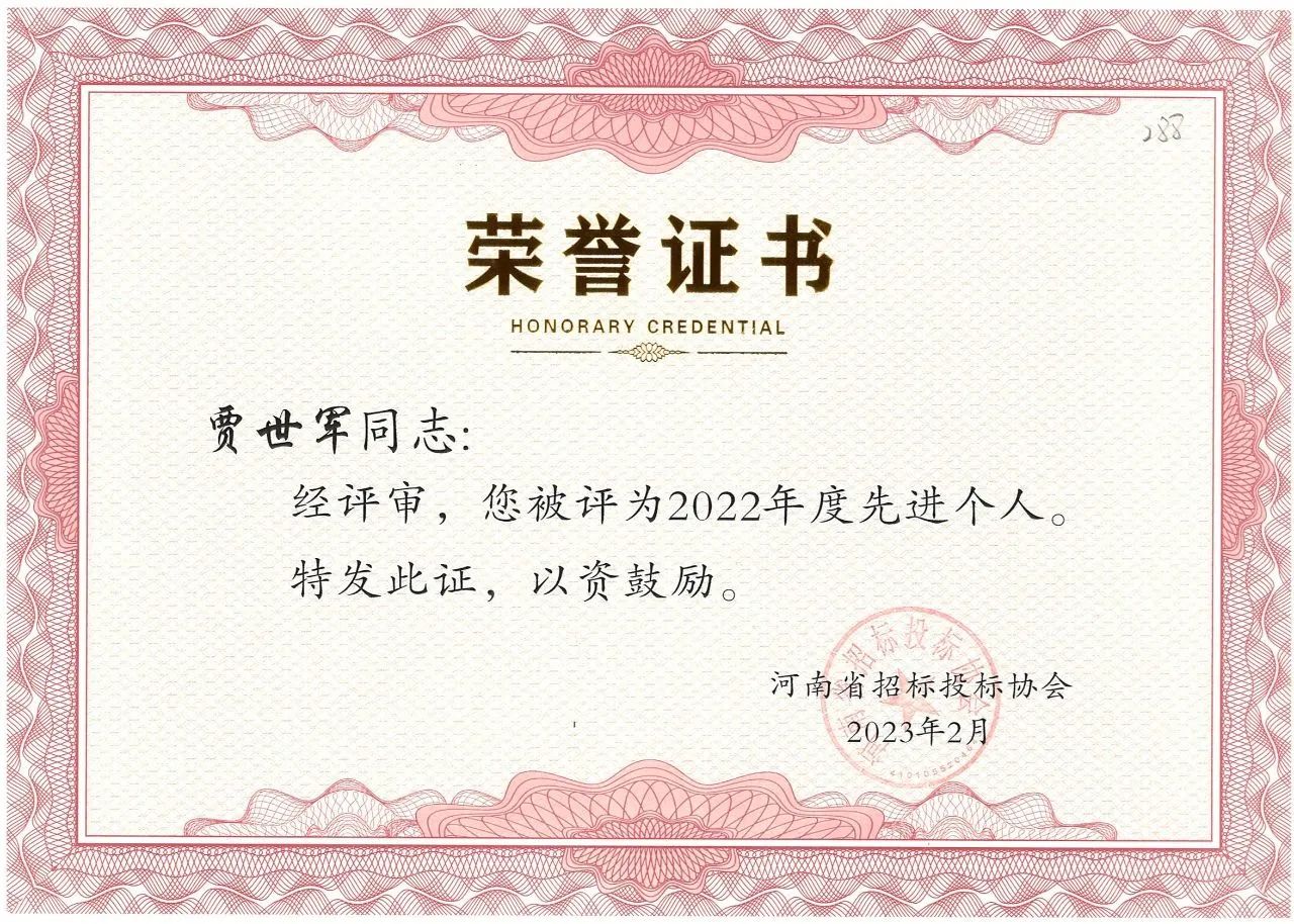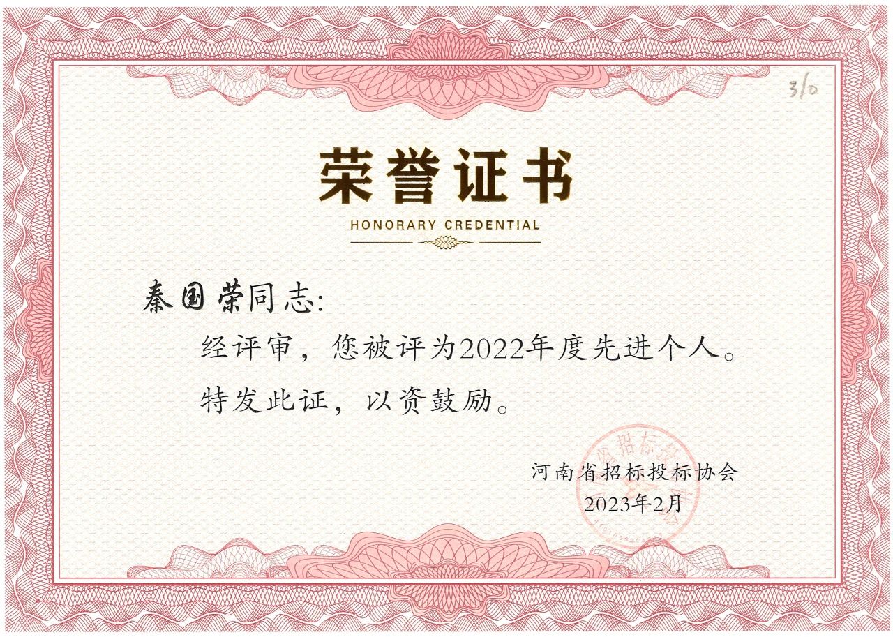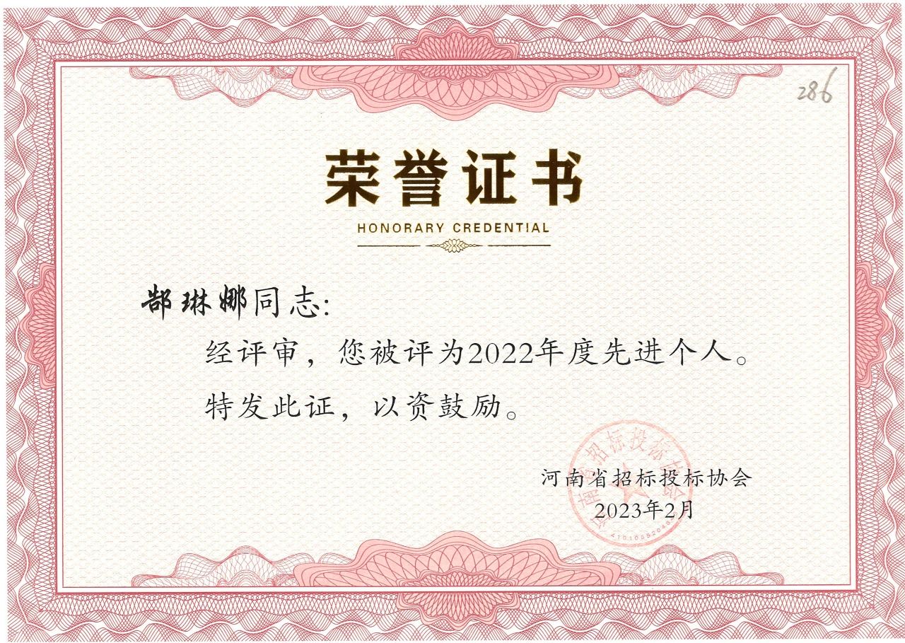 近日,河南省招標投標協(xié)會公布了“河南省招標投標協(xié)會關于表彰2022年度先進會員單位、先進個人的決定”。我公司榮獲2022年度先進會員單位榮譽稱號,八位同志獲得先進個人的榮譽。