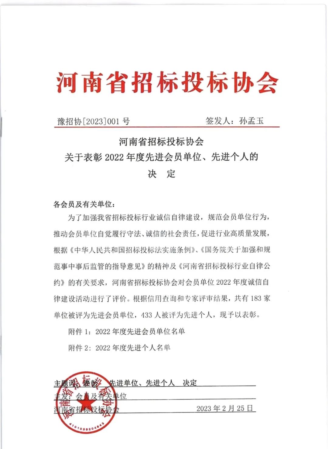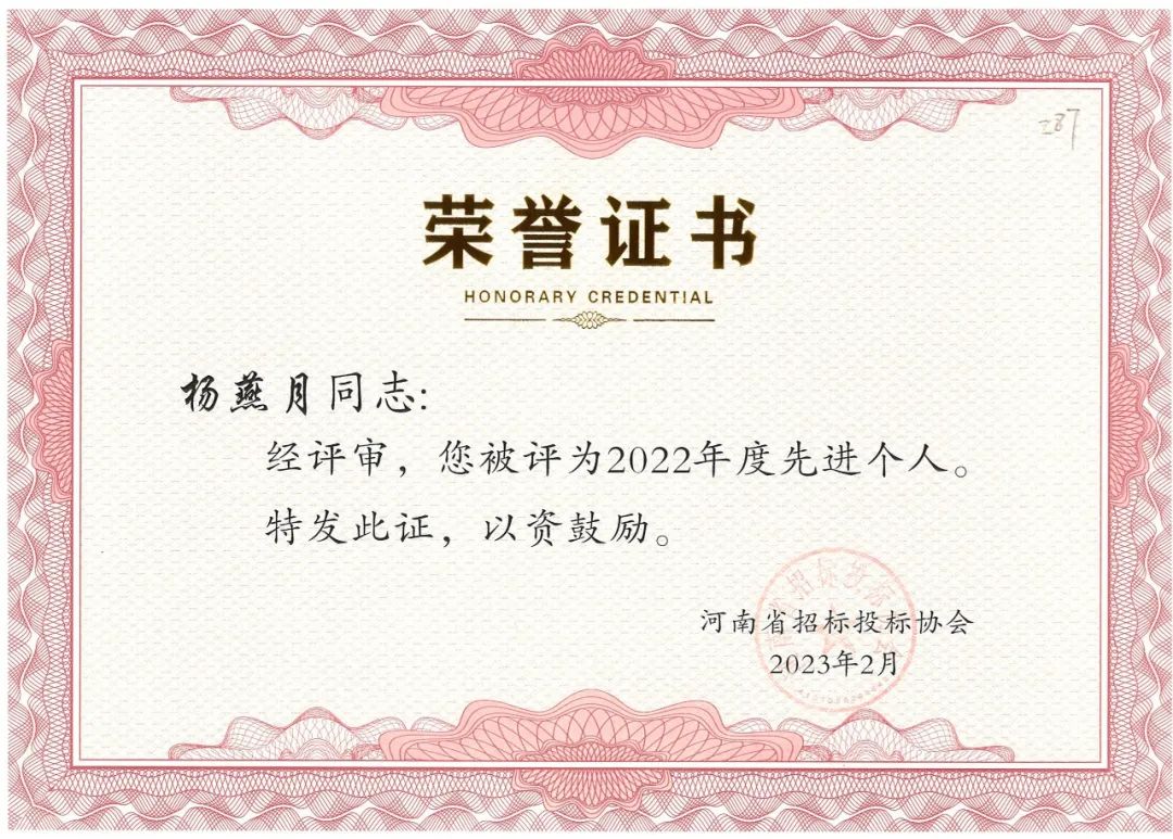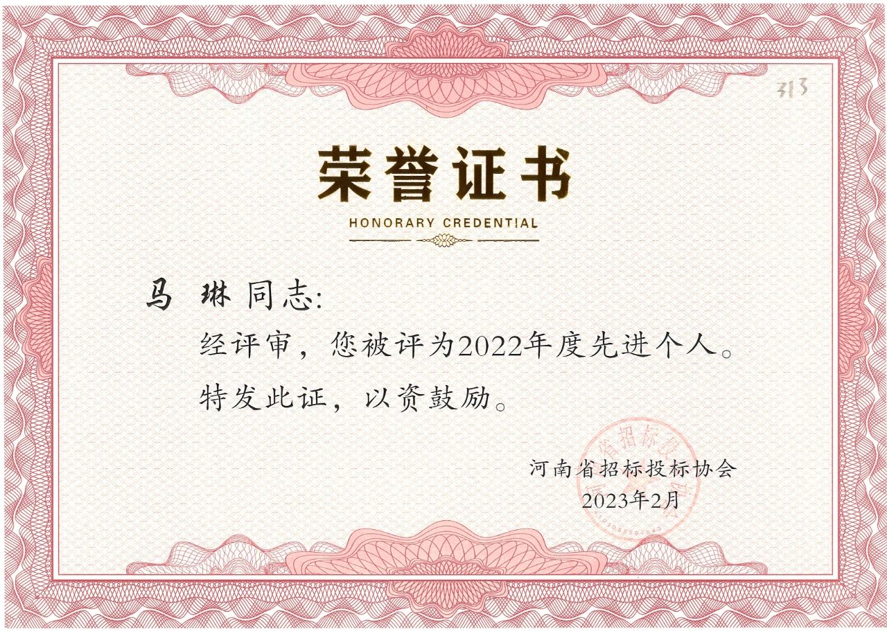 近日,河南省招標投標協(xié)會公布了“河南省招標投標協(xié)會關于表彰2022年度先進會員單位、先進個人的決定”。我公司榮獲2022年度先進會員單位榮譽稱號,八位同志獲得先進個人的榮譽。