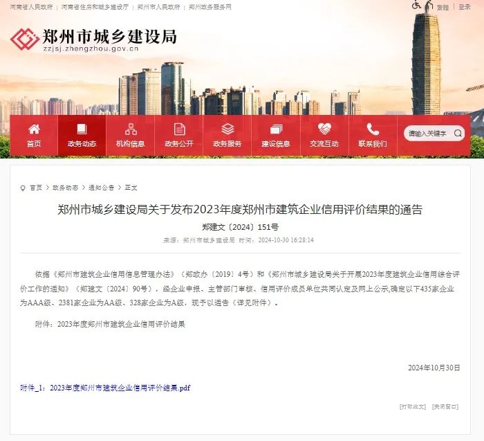 近日,鄭州市城鄉(xiāng)建設(shè)局關(guān)于2023年度鄭州市建筑企業(yè)信用評(píng)價(jià)審核結(jié)果的公告,中興豫建設(shè)管理有限公司榮獲
