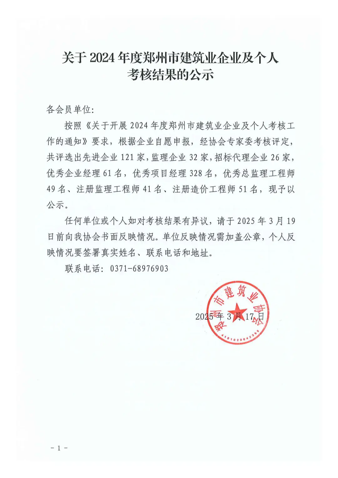 近日,鄭州市建筑業(yè)協(xié)會發(fā)布關(guān)于2024年度鄭州市建筑業(yè)企業(yè)及個人考核結(jié)果的公示。其中,中興豫建設(shè)管理有限公司榮幸入選“鄭州市建筑業(yè)優(yōu)秀監(jiān)理企業(yè)”、“鄭州市建筑業(yè)優(yōu)秀招標(biāo)代理企業(yè)”。