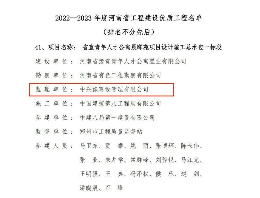 近日,河南省工程建設(shè)協(xié)會(huì)公布了“2022-2023年度河南省工程建設(shè)優(yōu)質(zhì)工程評(píng)價(jià)結(jié)果的通知”,由中興豫建設(shè)管理有限公司擔(dān)任監(jiān)理單位的“省直青年人才公寓晨暉苑項(xiàng)目設(shè)計(jì)施工總承包一標(biāo)段”、“省直青年人才公寓晨暉苑項(xiàng)目(6#、7#、8#、9#、10#、11#、15#樓、開閉所及地下車庫(kù))”、“惠濟(jì)區(qū)金洼小學(xué)新建項(xiàng)目”,共三項(xiàng)目齊上榜,紛紛獲得省級(jí)榮譽(yù)。