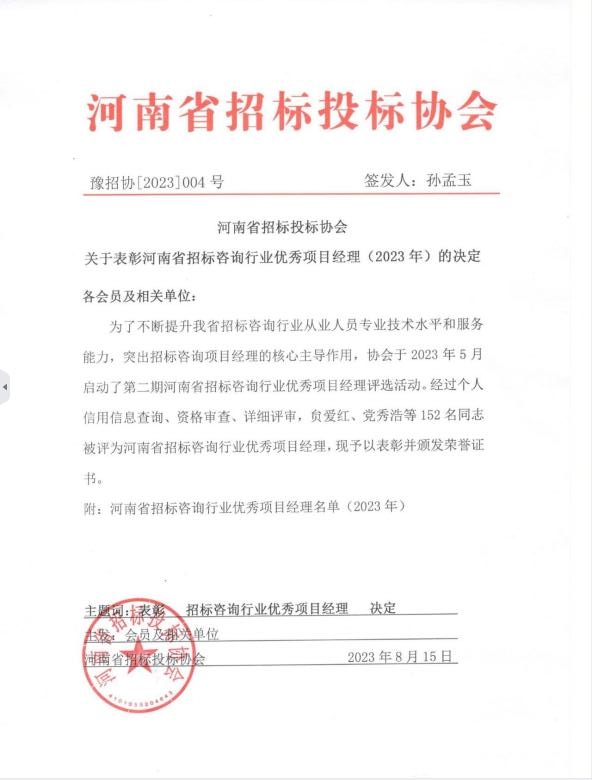近日,河南省招標(biāo)投標(biāo)協(xié)會(huì)公布了“關(guān)于表彰河南省招標(biāo)咨詢行業(yè)優(yōu)秀項(xiàng)目經(jīng)理(2023年)的決定”,經(jīng)個(gè)人信用信息查詢、資格審查、詳細(xì)評(píng)審等程序,我公司員工李杰、張彥令、徐文、鄭寧飛榮獲“2023年河南省招標(biāo)咨詢行業(yè)優(yōu)秀項(xiàng)目經(jīng)理”榮譽(yù)稱號(hào)!