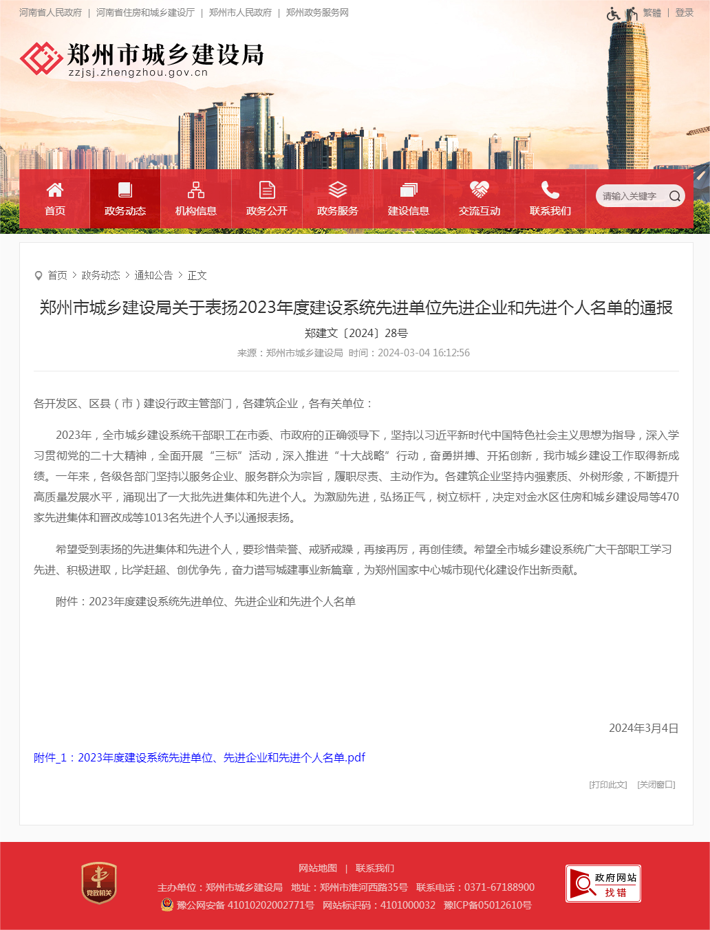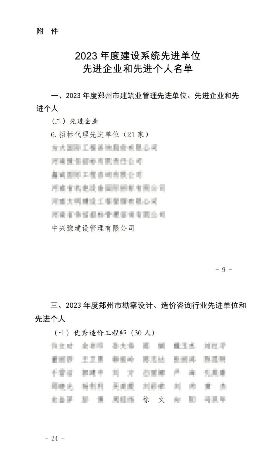 近日,鄭州市城鄉(xiāng)建設局公布了《關于表揚2023年度建設系統(tǒng)先進單位先進企業(yè)和先進個人名單的通報》,中興豫建設管理有限公司榮獲2023年度建設系統(tǒng)招標代理行業(yè)先進單位,造價師徐文榮獲優(yōu)秀造價工程師榮譽稱號!