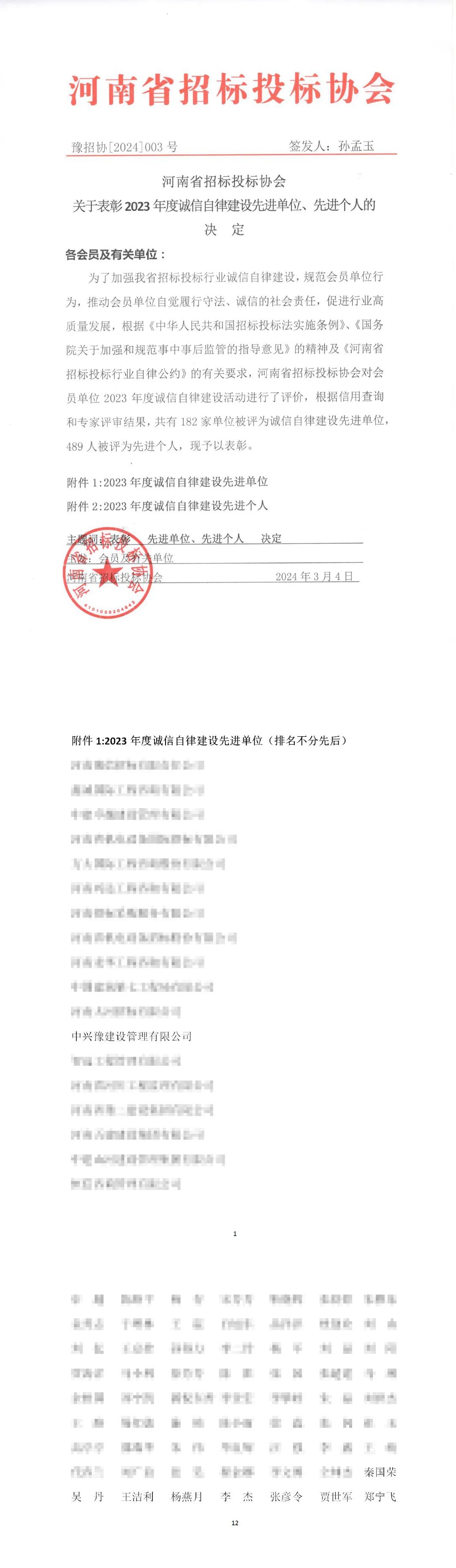 近日,河南省招標(biāo)投標(biāo)協(xié)會(huì)發(fā)布了《關(guān)于表彰2023年度誠(chéng)信自律建設(shè)先進(jìn)單位、先進(jìn)個(gè)人的決定》,中興豫建設(shè)管理有限公司再次榮獲“誠(chéng)信自律建設(shè)先進(jìn)單位”,八人榮獲“誠(chéng)信自律建設(shè)先進(jìn)個(gè)人”榮譽(yù)稱號(hào)。