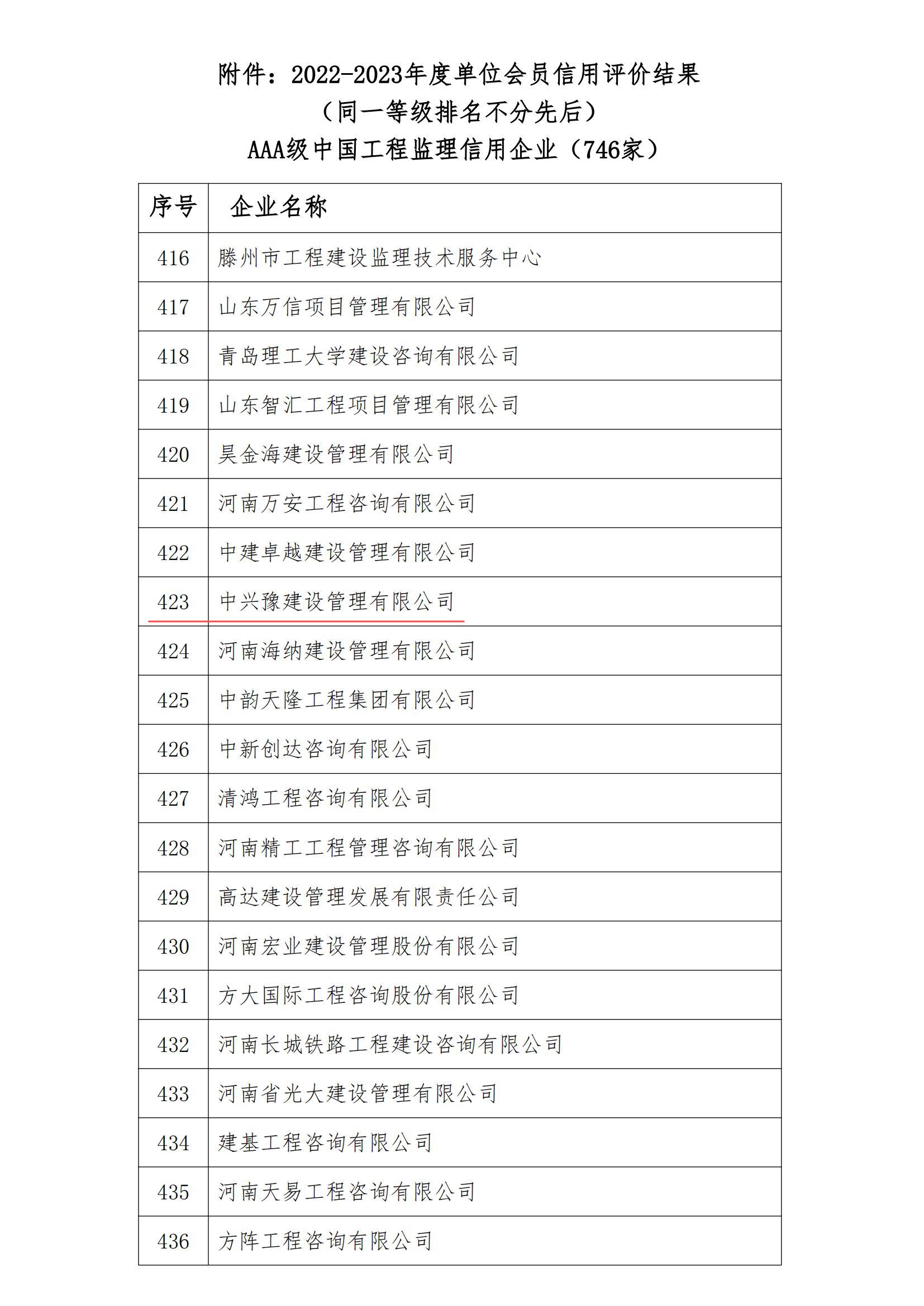 近日,中國建設(shè)監(jiān)理協(xié)會發(fā)布了《關(guān)于2022-2023年度中國建設(shè)監(jiān)理協(xié)會單位會員信用評價結(jié)果的公示》,經(jīng)自評、省級協(xié)會初評、專家評委綜合評審、公示、反饋、專家復(fù)核等評價程序,中興豫建設(shè)管理有限公司榮獲中國工程監(jiān)理信用評價AAA級企業(yè)!