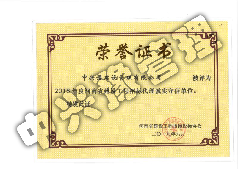 2018年度河南省建設(shè)工程招標代理誠實守信單位-公司榮譽