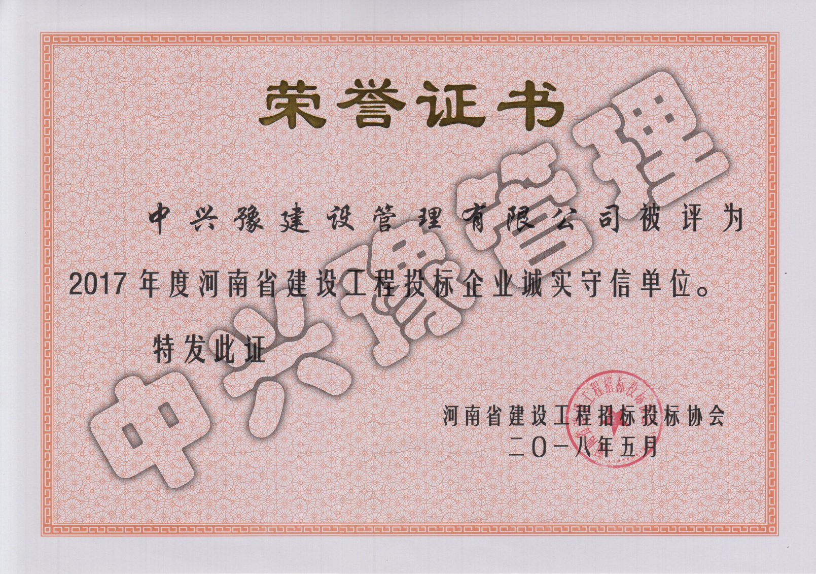 2017年度河南省建設(shè)工程投標(biāo)企業(yè)誠實(shí)守信單位-公司榮譽(yù)