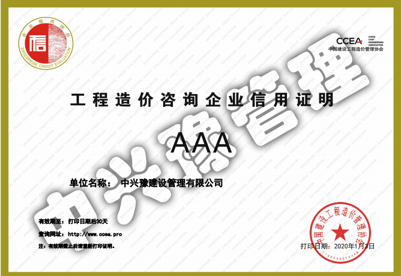 中價協(xié)頒發(fā)的工程造價咨詢信用AAA級企業(yè)-公司榮譽