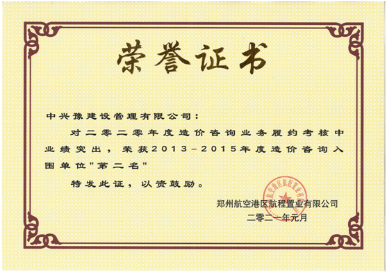近日,經(jīng)鄭州航空港區(qū)航程置業(yè)有限公司對(duì)2013-2015年度、2015-2017年度、2018-2019年度造價(jià)咨詢?nèi)雵鷨挝坏穆募s情況進(jìn)行嚴(yán)格、公平、公正的考評(píng),中興豫建設(shè)管理有限公司業(yè)績(jī)突出,榮獲2013-2015年度造價(jià)咨詢?nèi)雵鷨挝弧暗诙?,并授予榮譽(yù)證書。