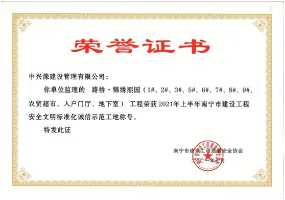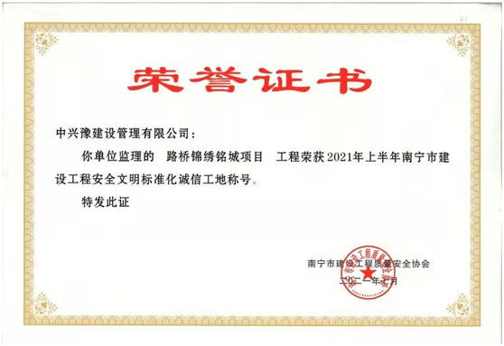 由中興豫建設(shè)管理有限公司監(jiān)理的路橋·錦繡熙園、路橋錦繡銘城項(xiàng)目在施工階段被評(píng)為“2021年上半年南寧市建設(shè)工程安全文明標(biāo)準(zhǔn)化誠信示范工地”。