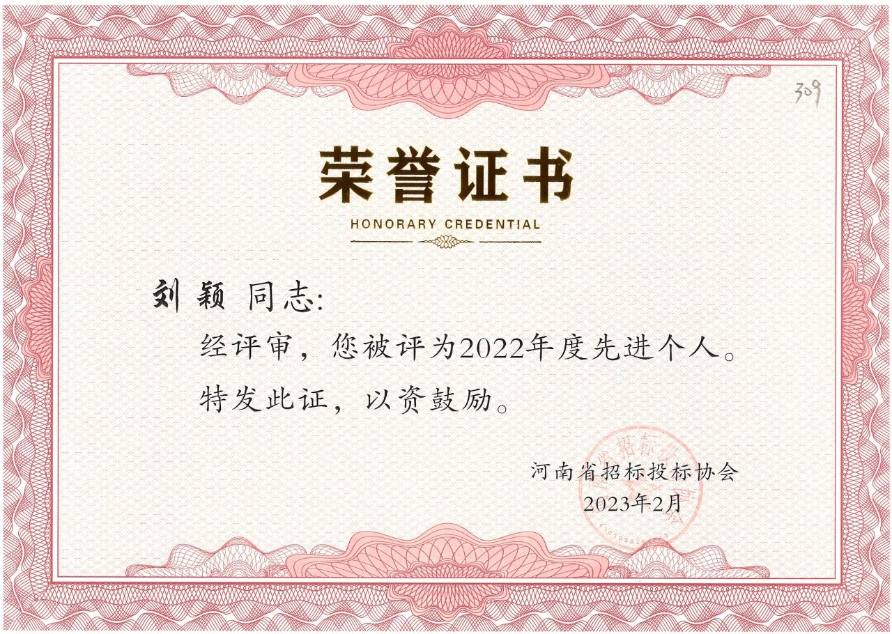 近日,河南省招標投標協(xié)會公布了“河南省招標投標協(xié)會關于表彰2022年度先進會員單位、先進個人的決定”。我公司榮獲2022年度先進會員單位榮譽稱號,八位同志獲得先進個人的榮譽。