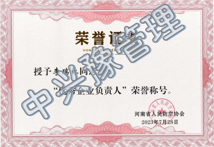 近日,河南省人民防空協(xié)會(huì)公布了“關(guān)于優(yōu)秀會(huì)員單位及個(gè)人結(jié)果的公告”。經(jīng)單位申請(qǐng)、專家評(píng)估、社會(huì)公示等程序,我公司榮獲優(yōu)秀會(huì)員單位榮譽(yù)稱號(hào),總裁李瑞林榮獲優(yōu)秀企業(yè)負(fù)責(zé)人榮譽(yù)稱號(hào)。
