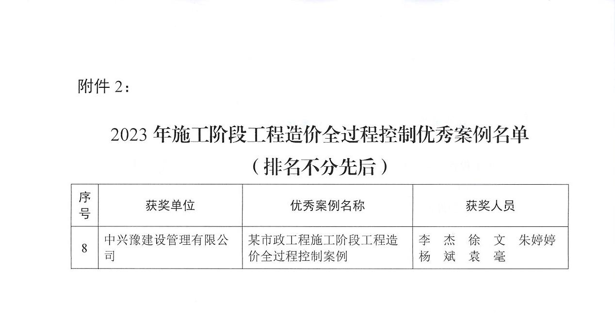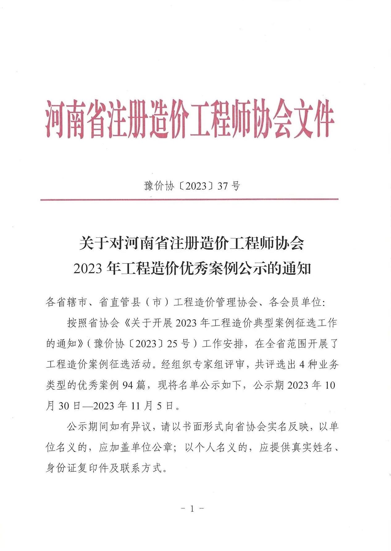 10月30日,10月30日,河南省注冊造價工程師協(xié)會公布了“河南省注冊造價工程師協(xié)會2023年工程造價優(yōu)秀案例公示的通知”,由中興豫建設(shè)管理有限公司負責的“某市政工程施工階段工程造價全過程控制案例”項目榜上有名。