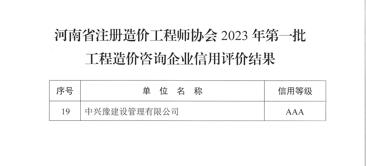 近日,河南省注冊(cè)造價(jià)工程師協(xié)會(huì)公布了《2023年第一批工程造價(jià)咨詢企業(yè)信用評(píng)價(jià)結(jié)果的通知》,經(jīng)單位申報(bào)、專家組評(píng)審、公示等程序,中興豫建設(shè)管理有限公司榮獲2023年工程造價(jià)咨詢企業(yè)信用等級(jí)AAA級(jí)企業(yè)!