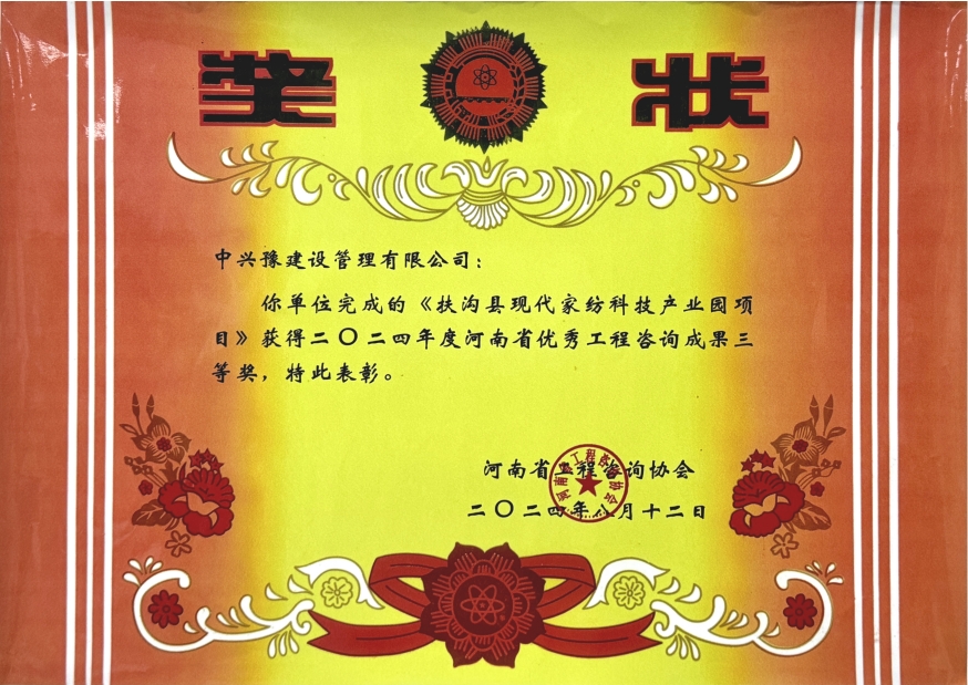 近日河南省工程咨詢協(xié)會公布了《2024年度全省優(yōu)秀工程咨詢成果獎獲獎項目的通知》。經(jīng)會員單位申報、專家小組認(rèn)真評審等程序,我公司申報的“扶溝縣現(xiàn)代家紡科技產(chǎn)業(yè)園項目”榮獲三等獎