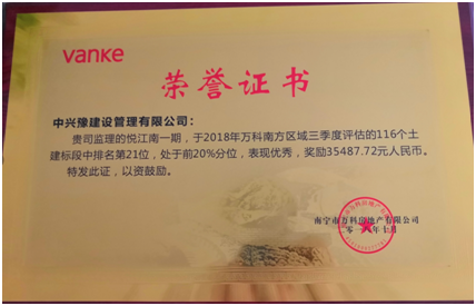 本項(xiàng)目在萬(wàn)科房地產(chǎn)有限公司于2018年組織的南方區(qū)域三季度評(píng)估的116個(gè)土建標(biāo)段中位列第21位,處于前20%分位,表現(xiàn)優(yōu)秀,獲得優(yōu)秀標(biāo)段“榮譽(yù)證書”,并獲獎(jiǎng)金 35487.72元。
