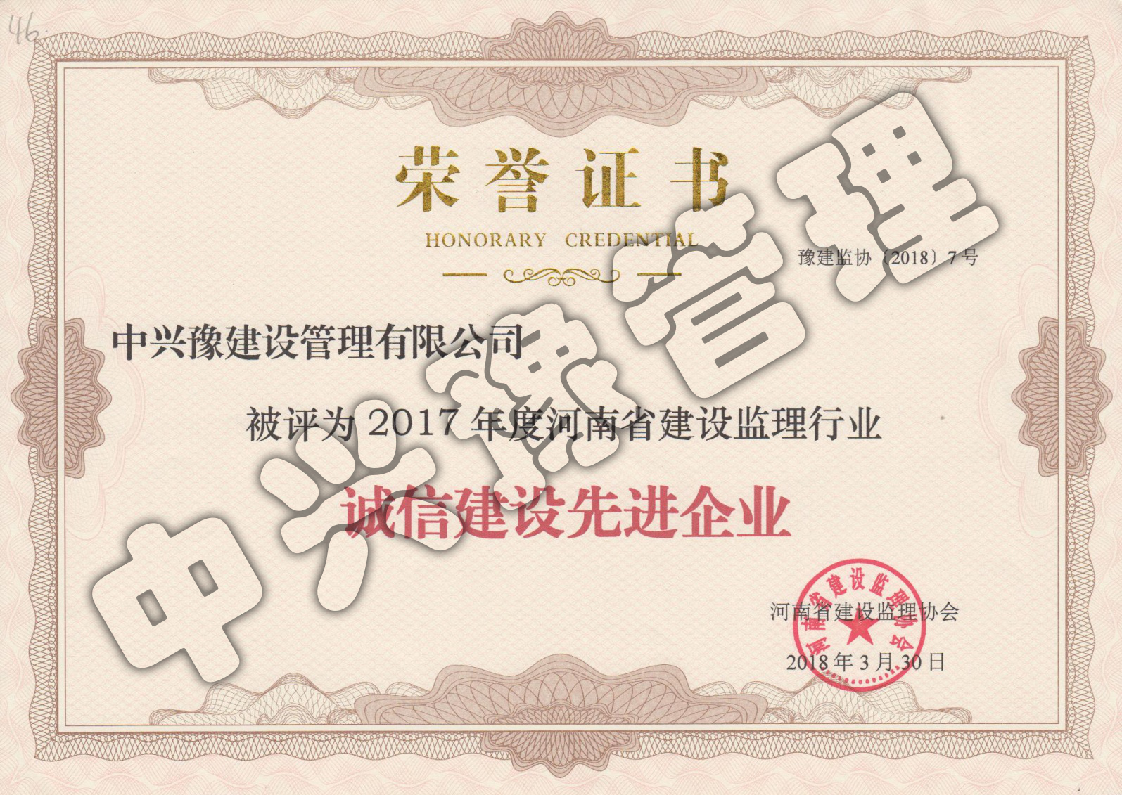 2017年度誠信建設監(jiān)理企業(yè)-公司榮譽